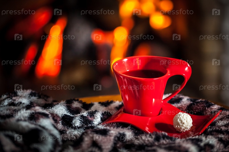 Красная чашка чая или кофе с шоколадом возле камина на деревянном столе.Зимняя и рождественская концепция праздника