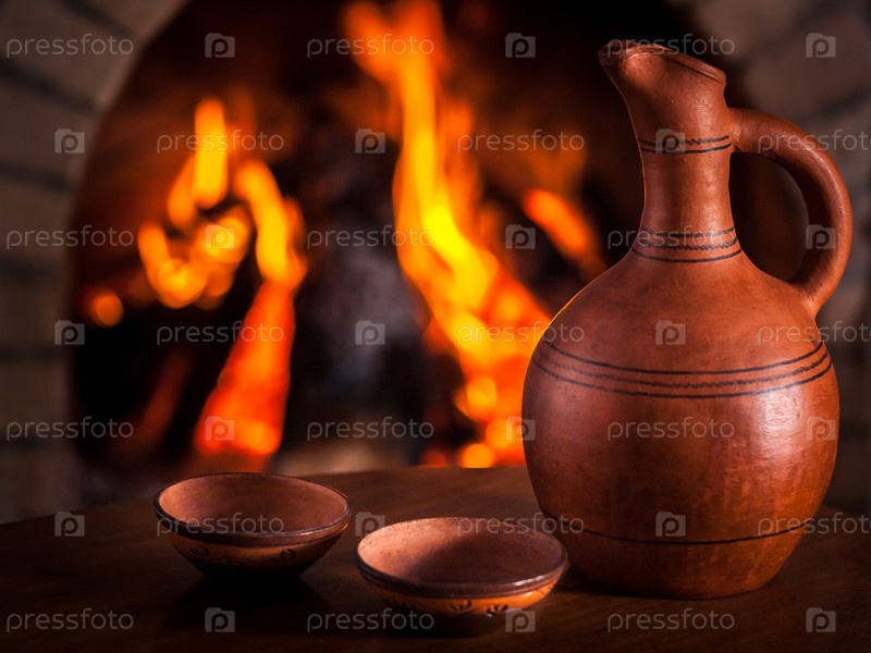 Грузинская глиняная керамика на уютном фоне камина, зимние каникулы, в загородном доме