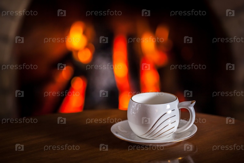 Белый стакан чая или кофе возле камина на деревянном столе.Зимняя и рождественская концепция праздника