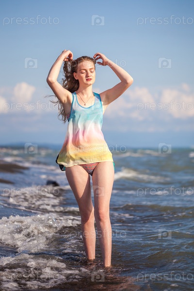 Красивая строительная блондинка в море, солнечный день