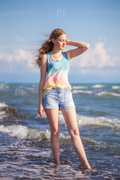 Красивая строительная блондинка в море, солнечный день