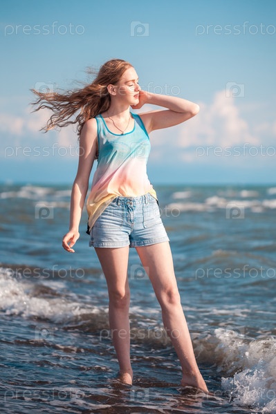 Красивая строительная блондинка в море, солнечный день