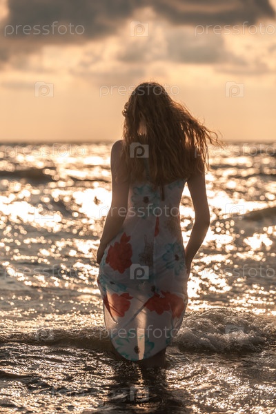 Красивая строительная девушка в море во время захода солнца