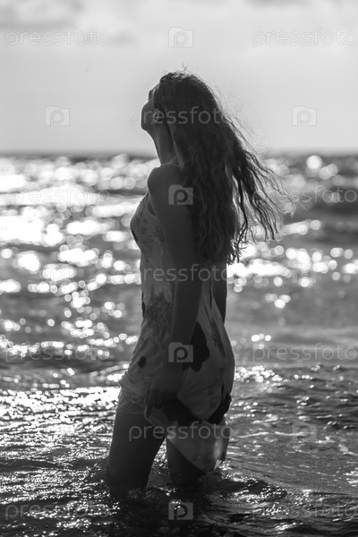 Красивая строительная девушка в море во время захода солнца