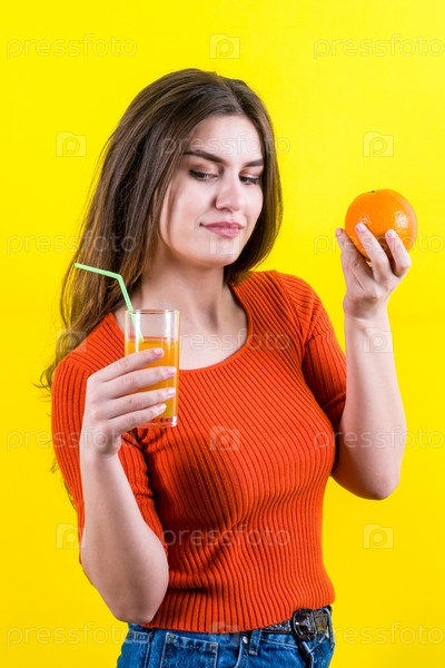 Красивая счастливая девушка с желтым апельсином и апельсиновым соком на жёлтом фоне