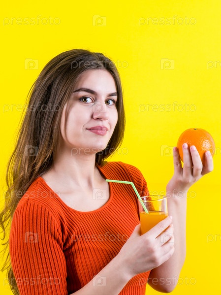 Красивая счастливая девушка с желтым апельсином и апельсиновым соком на жёлтом фоне