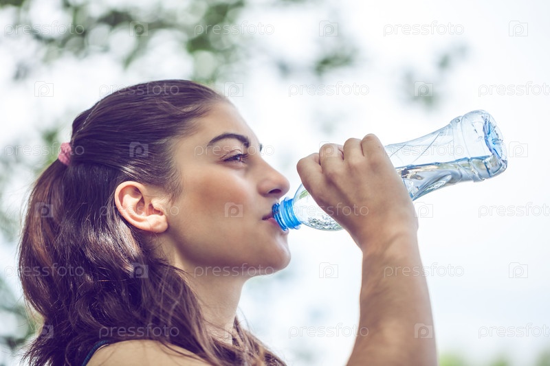 Портрет красивой темнокожей девушки, пьющей воду в летнем зеленом парке