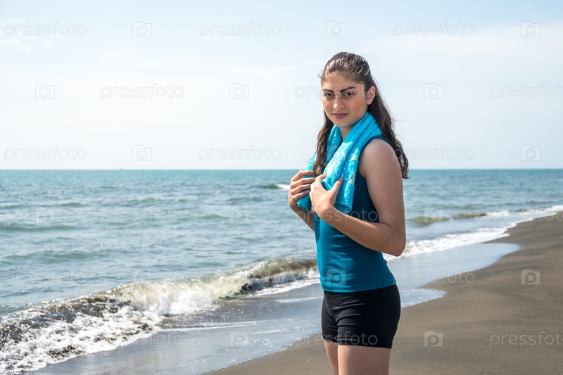 Красивая спортивная девушка на пляже после тренировки с полотенцем