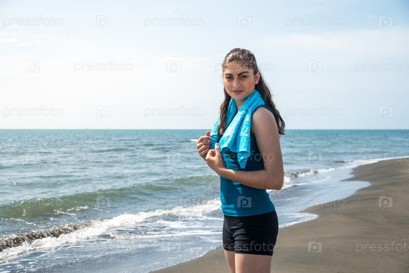 Красивая спортивная девушка на пляже после тренировки с полотенцем