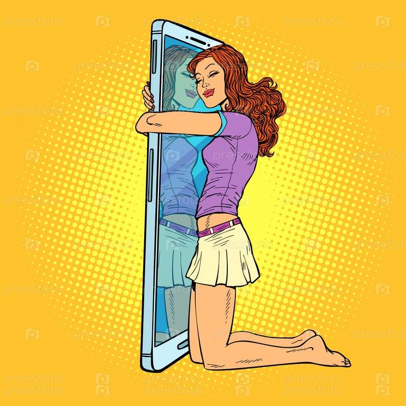 Молодая женщина обнимает смартфон, наслаждается его гаджетом