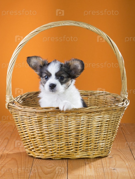 Маленький щенок породы папильон в плетеной корзине