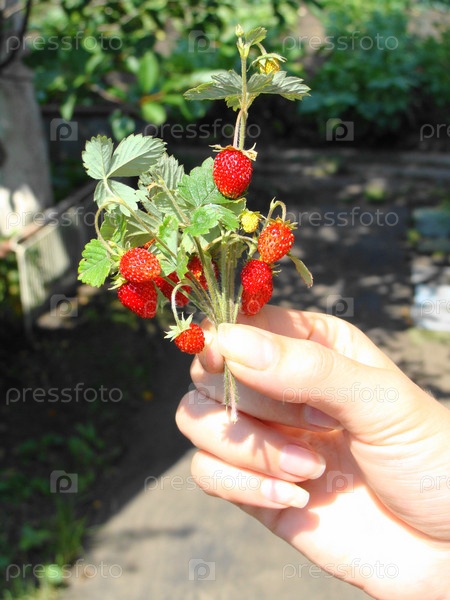 Веточки яркой красной земляники в руке