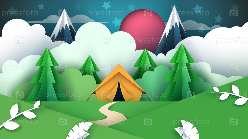 Иллюстрация на бумаге из мультфильмов: палатка, облако, гора, звезда, дерево, лес