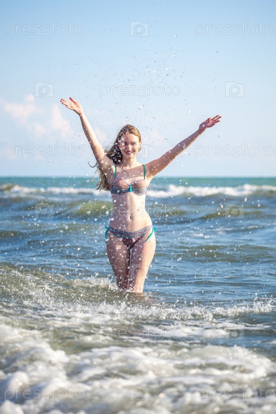 Привлекательная девушка в бикини играет с морскими волнами