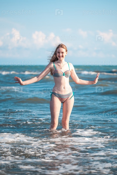 Привлекательная девушка в бикини играет с морскими волнами