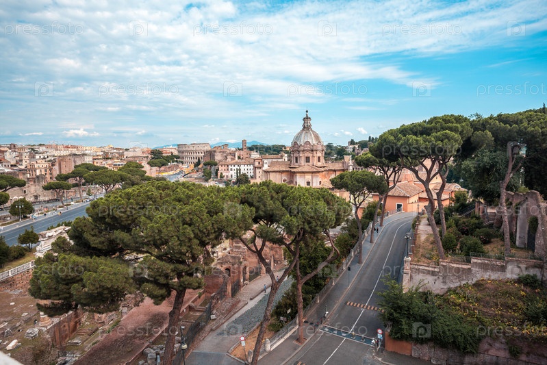 Причудливый вид с воздуха на Колизей, Римский форум в Риме и церковь Санти-Луки и Мартины, Италия