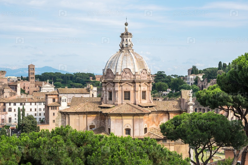Причудливый вид с воздуха на Колизей, Римский форум в Риме и церковь Санти-Луки и Мартины, Италия