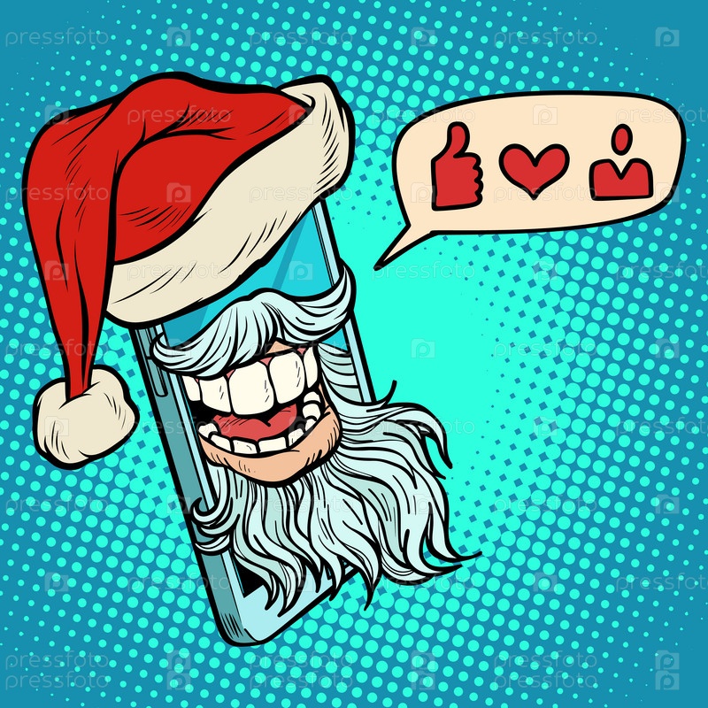 Санта Клаус размещает лайки через смартфон