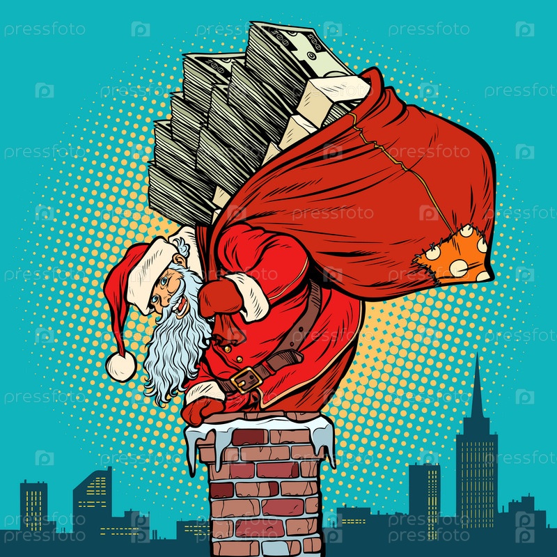 Санта-Клаус с деньгами поднимается в дымоход