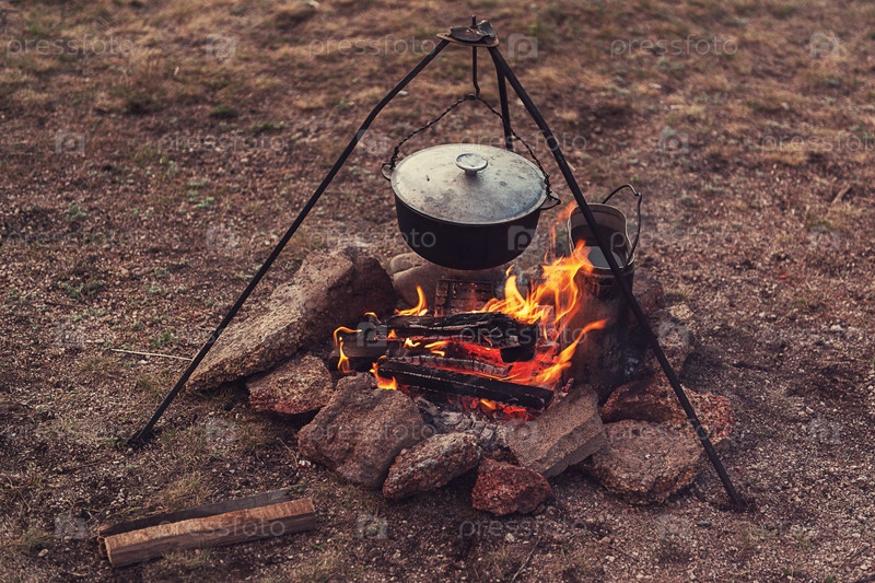 Приготовление пищи на костре в диком кемпинге, отдых на природе