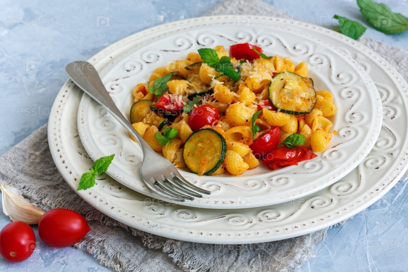 Макароны с кабачками и вишневыми помидорами
