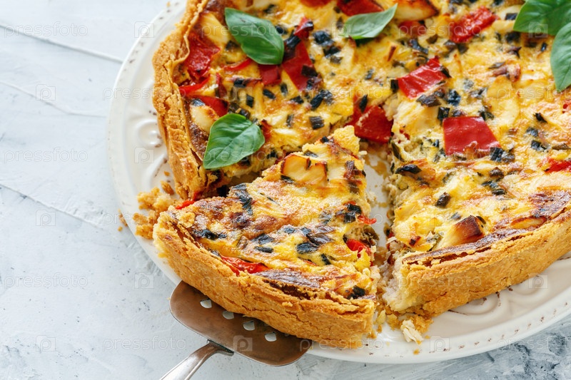 Кусок пирога из курицы, лука, сладкого перца и базилика