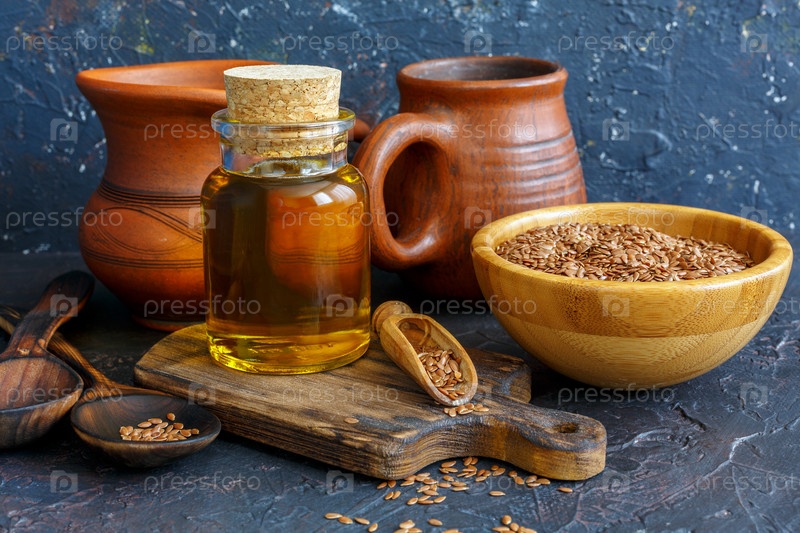 Бутылка льняного масла холодным прессованием и семена льна в деревянной таре