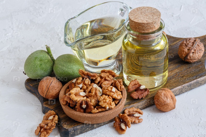 Ореховое масло в бутылке и стеклянной чашке