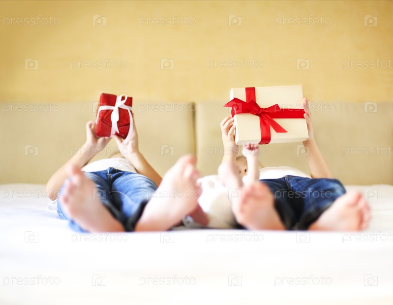 Сладкая семья в постели.Три сестры, с близкого расстояния на коробке для подарков
