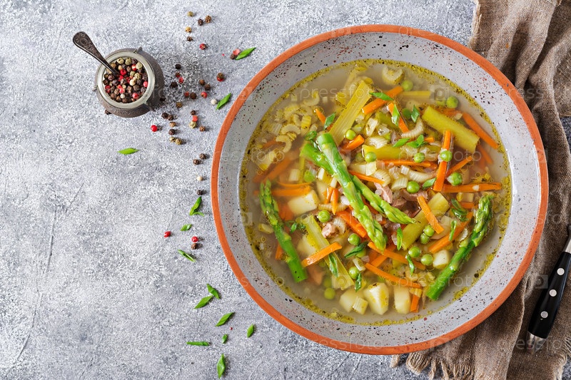 Суп с говядиной, спаржами, зеленым горохом, морковью и сельдерем. Диетическое меню. Здоровая пища. Плоская ложка. Вид сверху