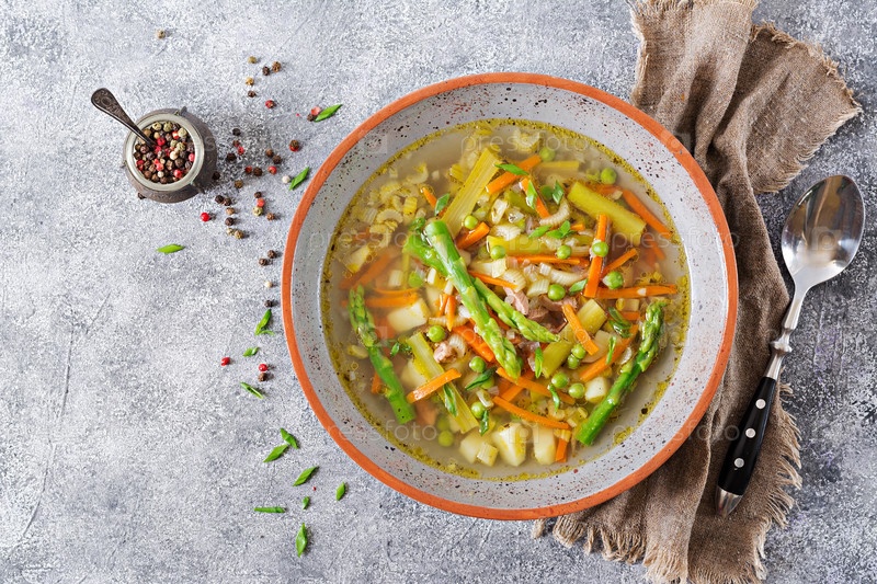 Суп с говядиной, спаржами, зеленым горохом, морковью и сельдерем. Диетическое меню. Здоровая пища. Плоская ложка. Вид сверху