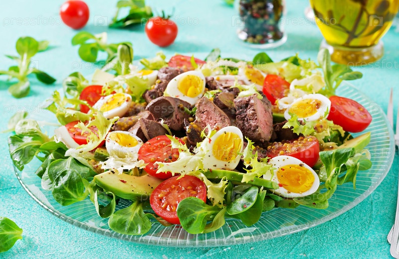 Теплый салат из куриной печени, авокадо, помидора и перепелиных яиц. Здоровый ужин. Диетическое меню