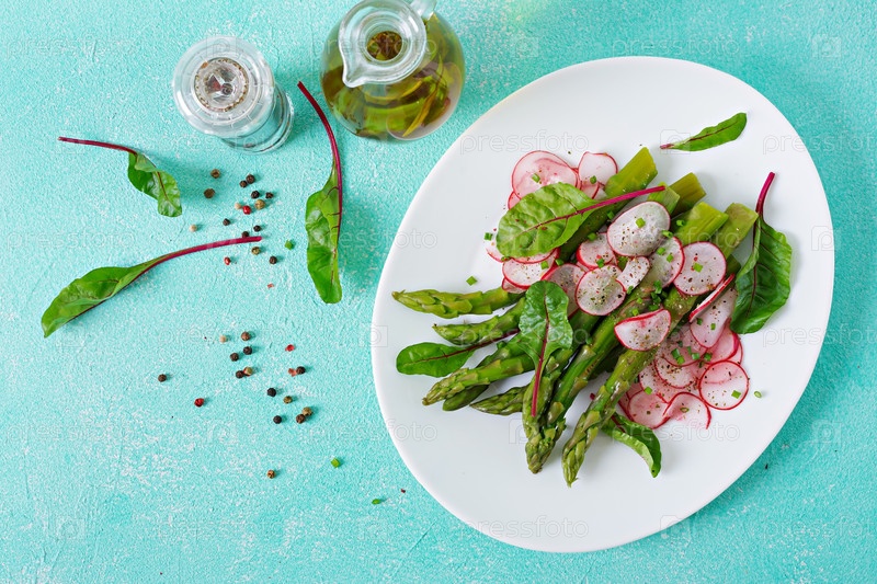 Салат из спаржа с редисом и хрястом. Веганская кухня. Здоровая еда. Плоский слой. Вид сверху