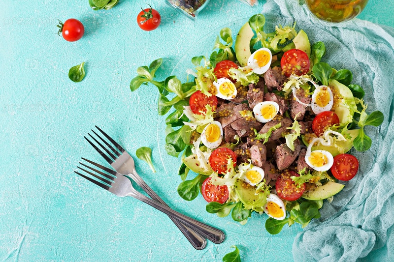 Теплый салат из куриной печени, авокадо, томатов и перепелиных яиц. Здоровый ужин. Диетическое меню. Плоское положение. Вид сверху
