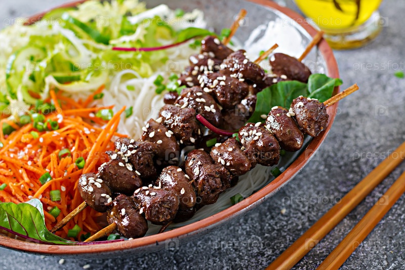 Куриные сердца в пряном соусе, лапша и овощный салат