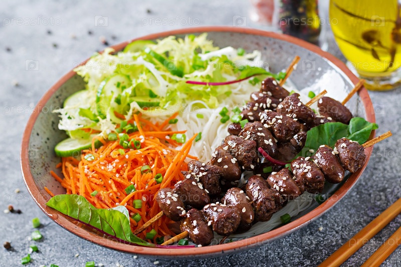 Куриные сердца в пряном соусе, лапша и овощный салат