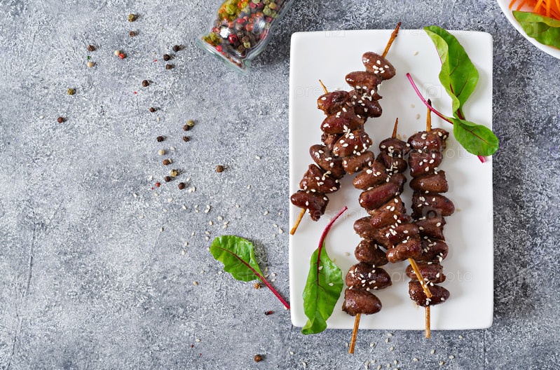 Куриные сердца в пряном соусе на белой тарелке.Здоровая еда.Вид сверху