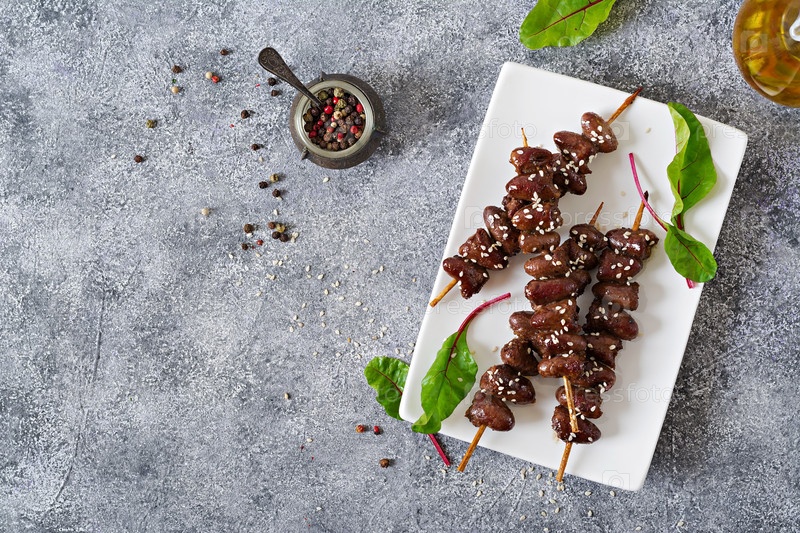 Куриные сердца в пряном соусе на белой тарелке.Здоровая еда.Вид сверху
