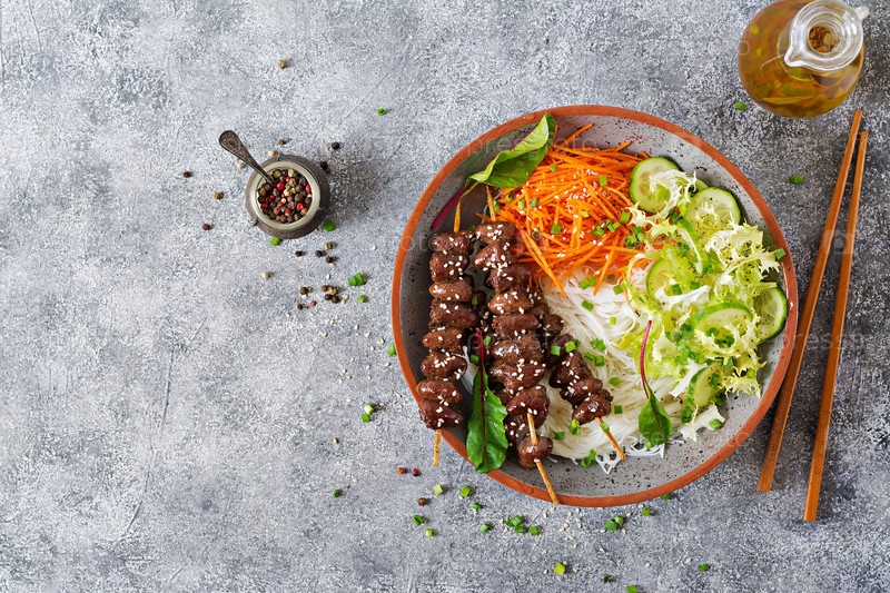 Куриные сердца в пряном соусе, лапша и овощный салат. Здоровая еда. Вид сверху