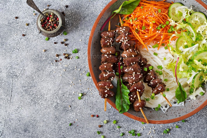 Куриные сердца в пряном соусе, лапша и овощный салат. Здоровая еда. Вид сверху