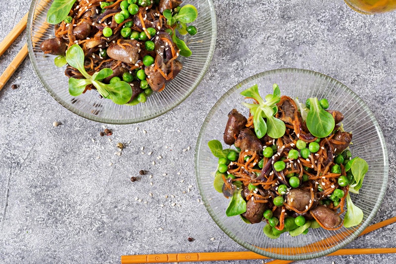 Куриное сердце с морковью, луком и зеленым горохом в азиатском стиле