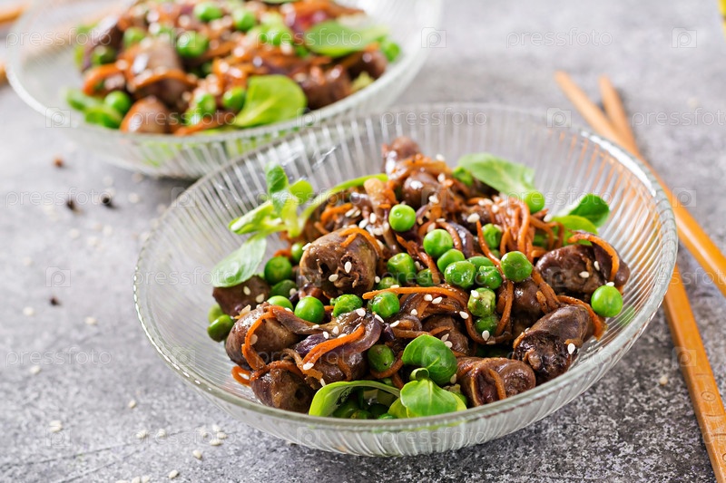 Куриное сердце с морковью, луком и зеленым горохом в азиатском стиле