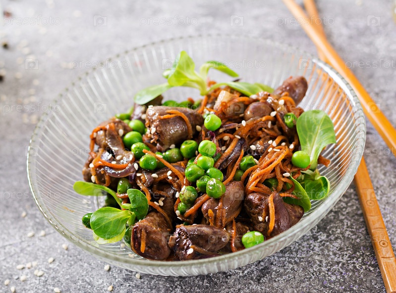Куриное сердце с морковью, луком и зеленым горохом в азиатском стиле