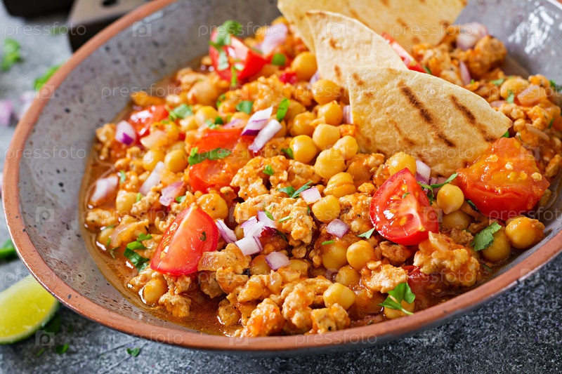 Chili con carne of turkey with chickpeas served with nachos. чили с мясом, начос, лаймом, пряным перцем. мексиканская / техасская традиционная еда