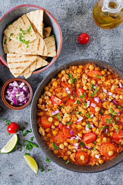 Чили с карне индейки с горохом, подаваемым с начо. чили с мясом, начо, лаймом, пряным перцем. мексиканская / техасская традиционная еда. вид сверху
