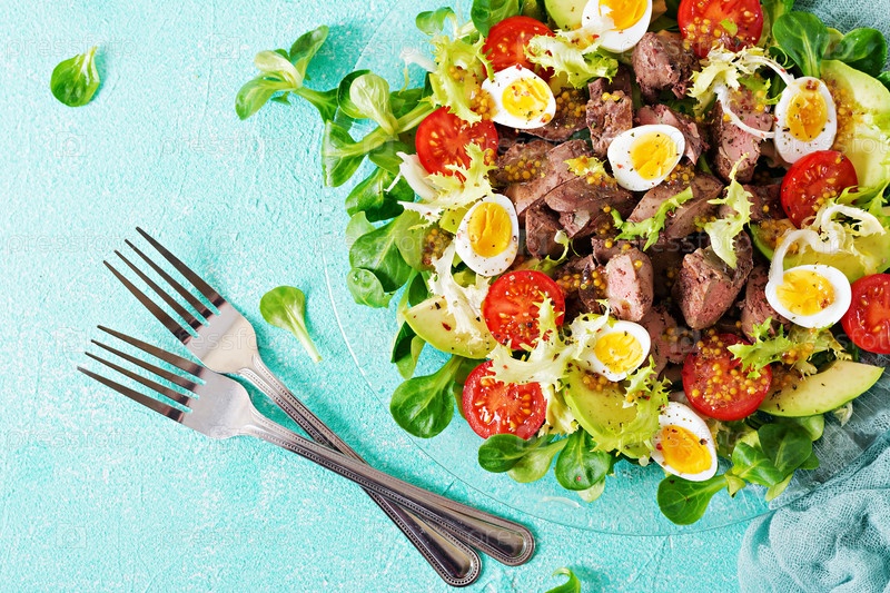 Теплый салат из куриной печени, авокадо, томатов и перепелиных яиц. Здоровый ужин. Диетическое меню. Плоское положение. Вид сверху