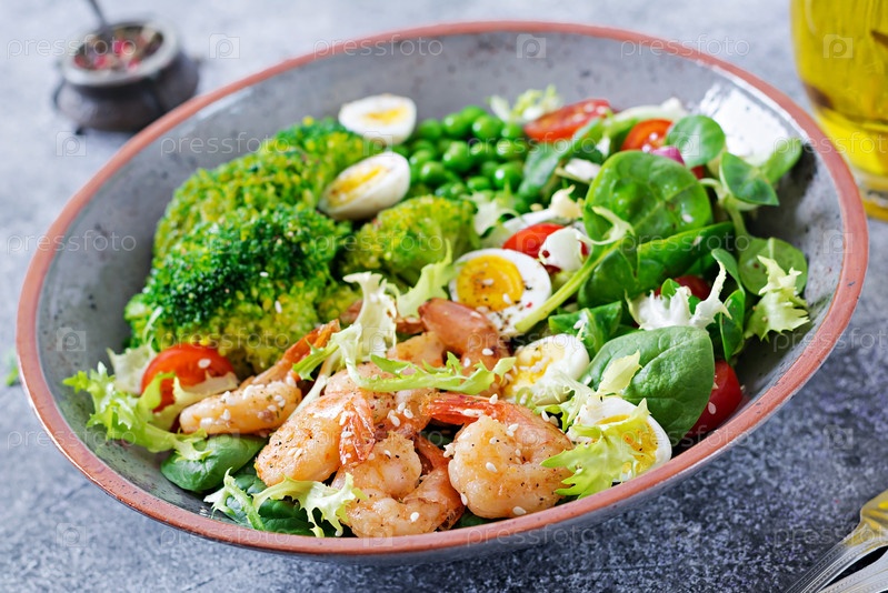 Здоровая салатная тарелка. Свежий рецепт морепродуктов. Жареные креветки и свежий овощный салат, яйца и брокколи. Жаренные креветы. Здоровая еда