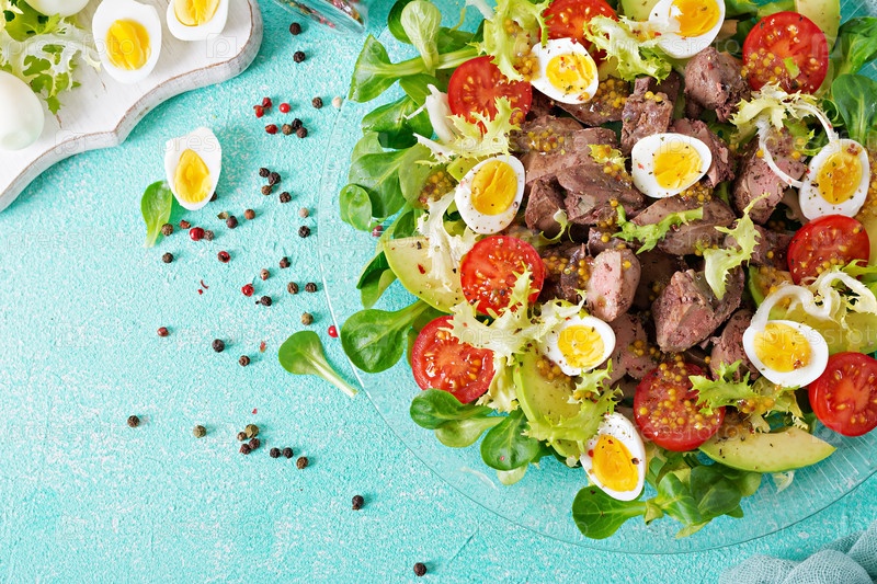 Теплый салат из куриной печени, авокадо, томатов и перепелиных яиц. Здоровый ужин. Диетическое меню. Плоское положение. Вид сверху