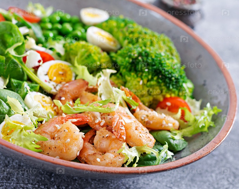 Здоровая салатная тарелка. Свежий рецепт морепродуктов. Жареные креветки и свежий овощный салат, яйца и брокколи. Жаренные креветы. Здоровая еда