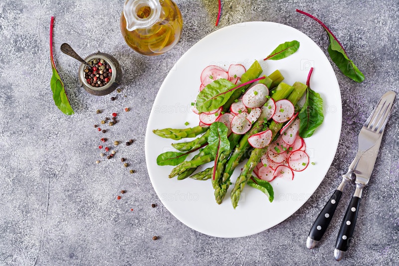 Салат из спаржа с редисом и хрястом. Веганская кухня. Здоровая еда. Плоский слой. Вид сверху